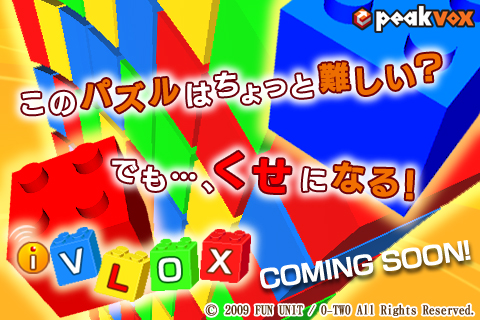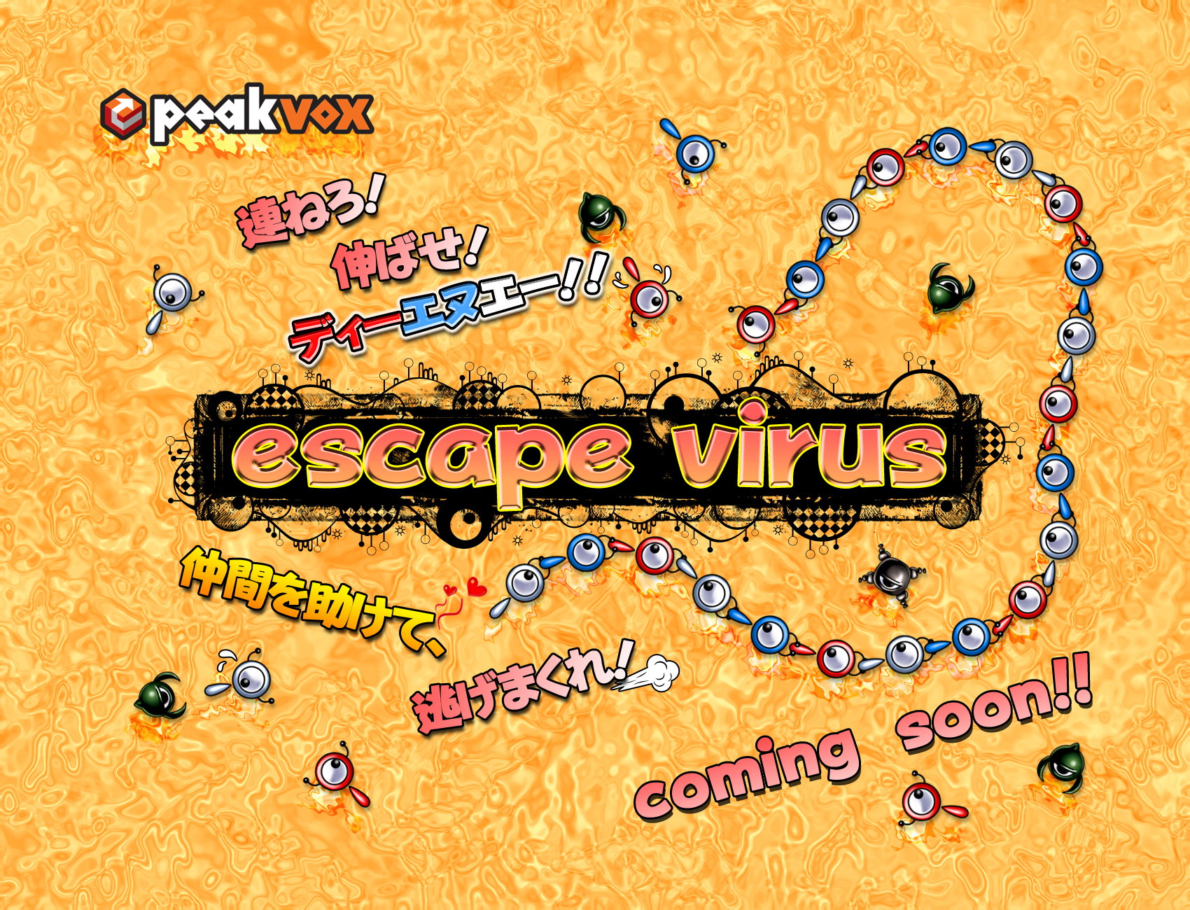 peakvoxからはすでに、ゼロヨン・レースゲーム『Rev Counter』(iPhone用アプリ)も配信中になっています。 また4月末には、"軟らかブロックをずらして遊ぶ"パズルゲーム『iVlox』(iPhone用アプリ)のリリースが決定しており、さらに5月末に、"か弱いDNAたちを助けて連ねて、凶悪なウィルスから集団で逃げていく"エスケープ・アクションゲーム『escape virus』がWiiウエアにてリリース予定となっています。