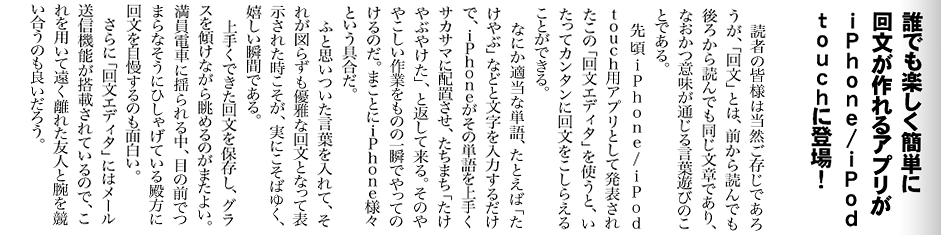 先頃iPhone/iPod touch用アプリとして発表されたこの「回文エディタ」を使うと、いたってカンタンに回文をこしらえることができる。
