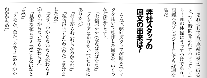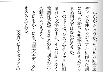 このように、システマティックに組まれた文字の中に、そこはかとなく物語性を感じさせるのも、回文の一つの魅力といえよう。